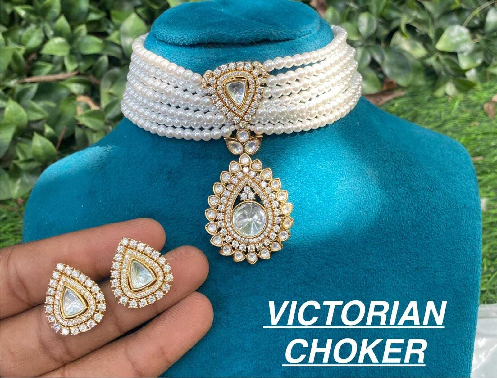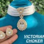 This image showcases a luxurious Victorian-style choker set featuring a multi-layered strand of lustrous white pearls paired with intricate gold and diamond-like embellishments. The centerpiece of the choker is a stunning teardrop-shaped pendant adorned with a large clear stone at its heart, surrounded by multiple layers of sparkling crystals and delicate gold detailing, exuding regal charm. Matching teardrop earrings complement the design, each showcasing the same central stone and halo of shimmering stones for a cohesive, elegant look. Perfect for bridal wear or grand occasions, this Victorian choker set blends traditional opulence with timeless sophistication.