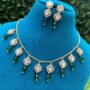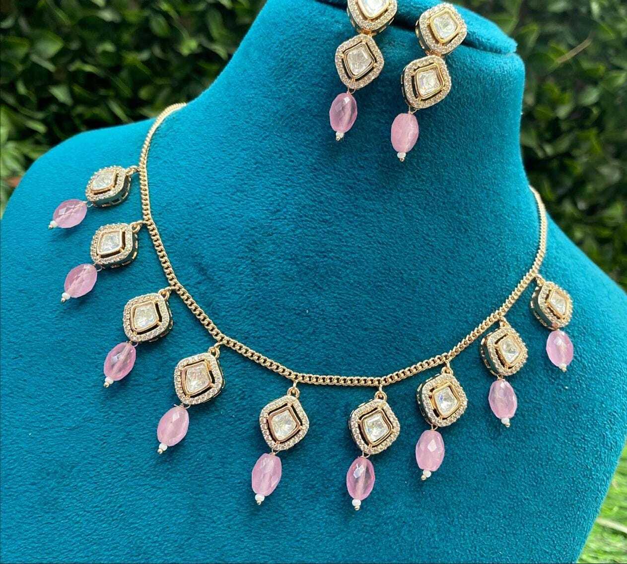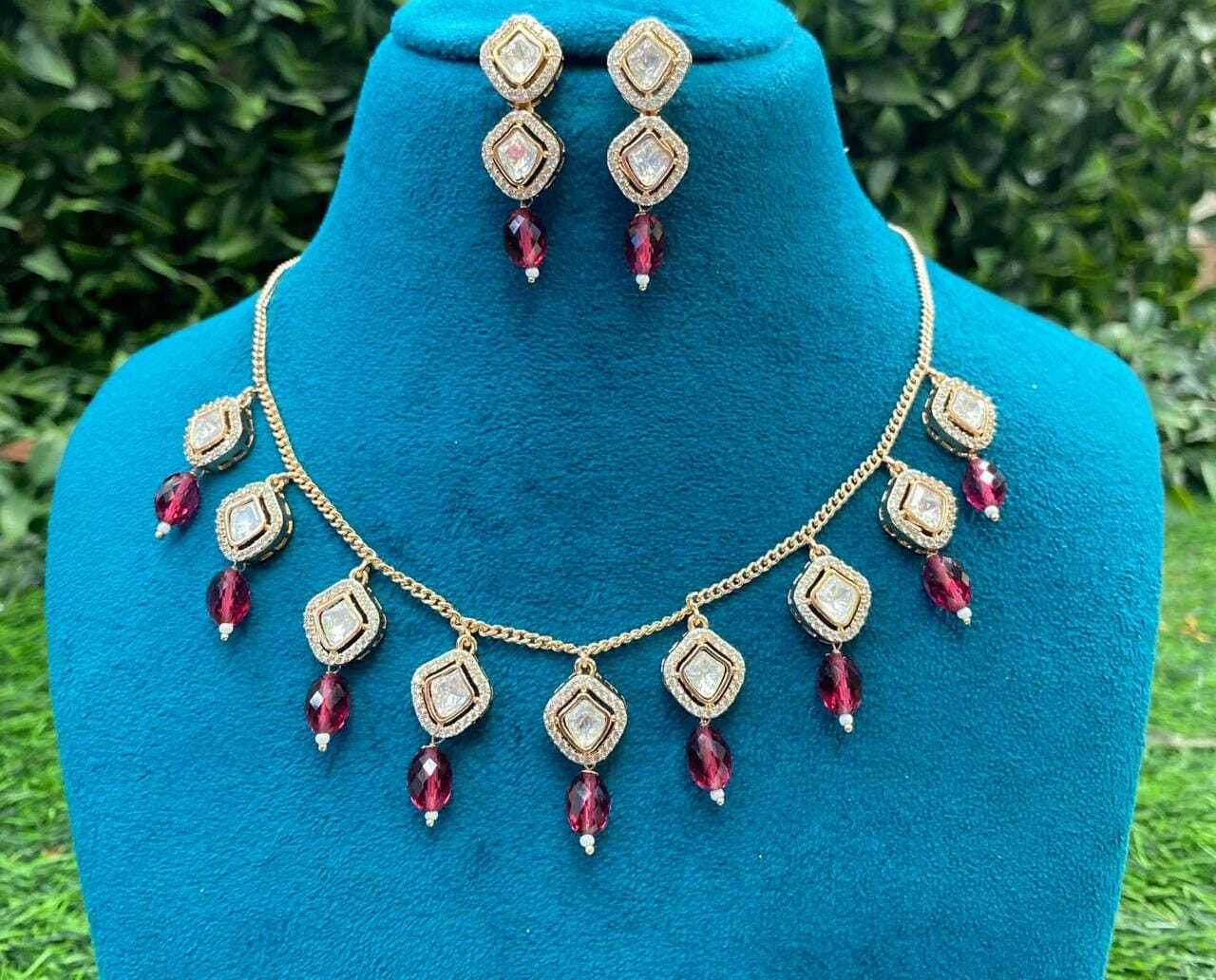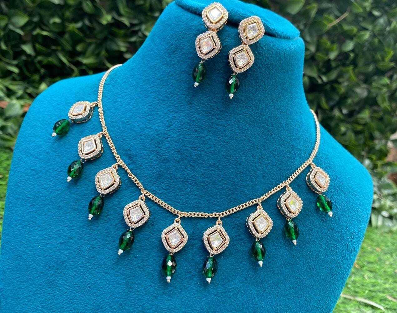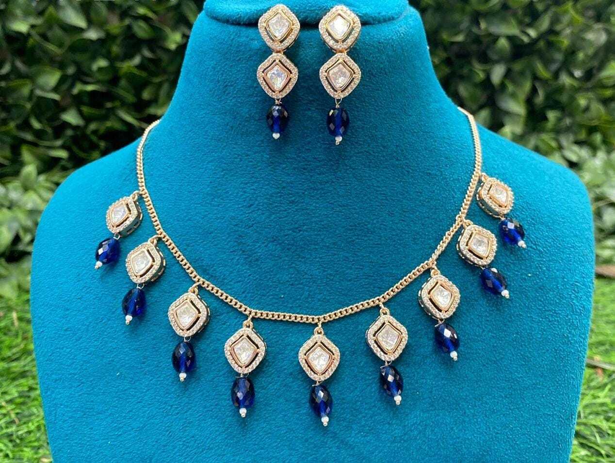This exquisite Royal Blue Kundan Necklace Set is a perfect fusion of ethnic elegance and modern sophistication. Crafted on a gold-toned alloy base with anti-tarnish polish, it features dazzling square-cut kundan stones bordered with fine zircons and adorned with deep royal blue crystal drops for a regal finish. The set includes a lightweight adjustable necklace and matching earrings, making it ideal for festive occasions, weddings, and special celebrations. Pair it with a saree or ethnic gown to elevate your look with timeless grace and a touch of royal glamour.