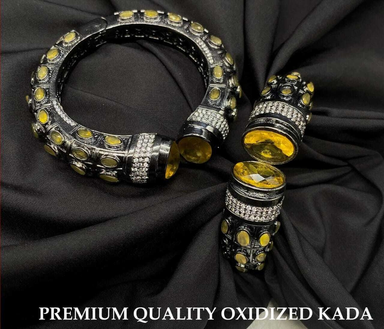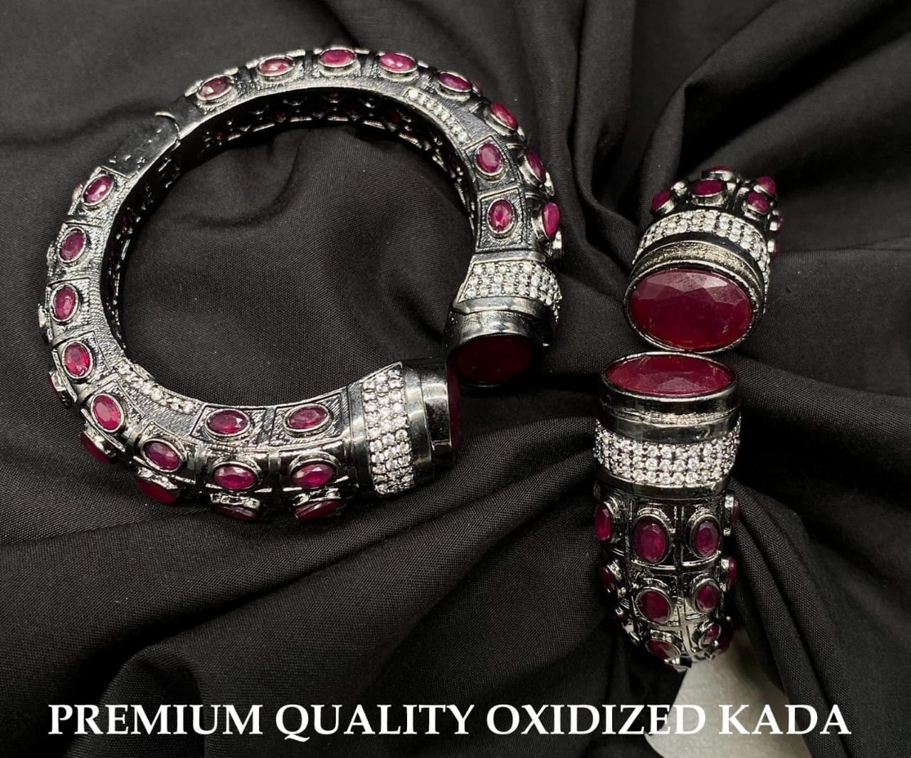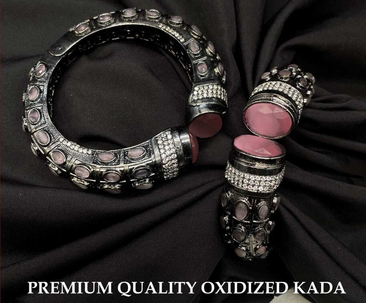 This Premium Quality Oxidized Kada is a bold statement of luxury and craftsmanship, designed for women who love contemporary elegance with a traditional edge. The kada is crafted from high-grade alloy with a rich oxidized silver finish, featuring intricately embossed detailing and lavender-hued stones that add a soft feminine contrast to its bold structure. Accented with micro zircon embellishments for a sparkling touch, it delivers both sophistication and strength in design. Lightweight yet durable, this openable kada ensures a comfortable fit and is perfect for festive occasions, parties, or fusion wear. Pair it with both ethnic and western outfits to exude timeless charm and confidence