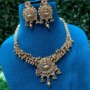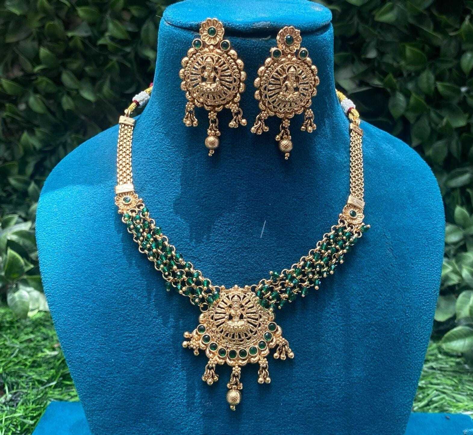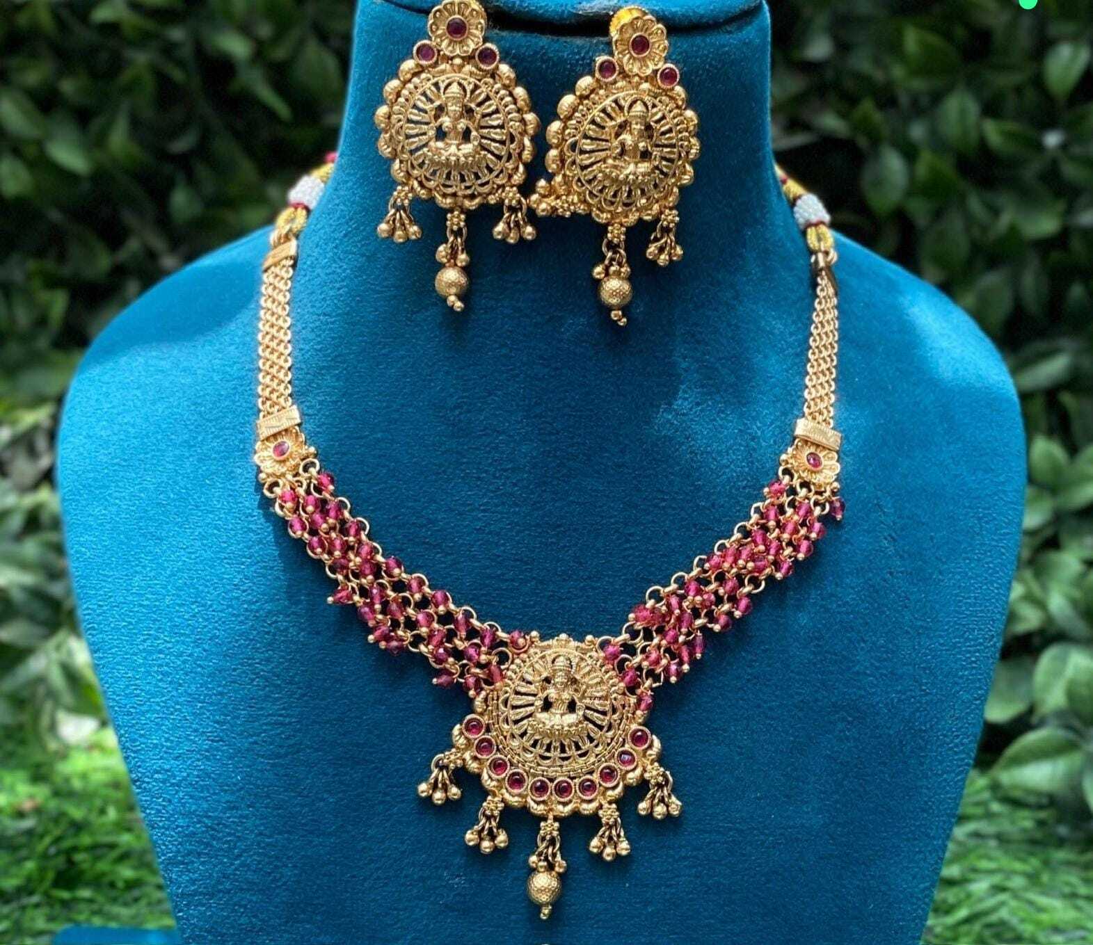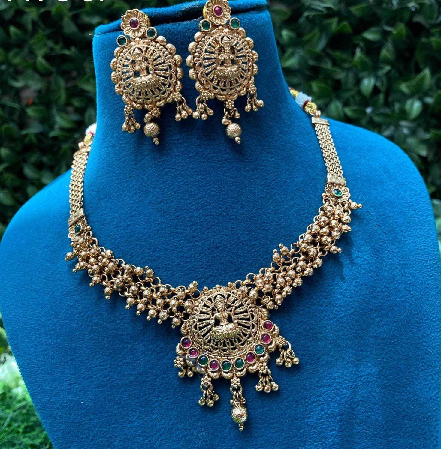 Embrace timeless tradition with this exquisite antique gold-plated temple jewelry set. The intricately crafted necklace features a divine temple motif at the center, surrounded by detailed filigree work and adorned with red and green stones for a royal touch. Dangling golden beads add movement and charm, enhancing its ethnic elegance.